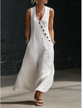Dam Maxiklänning Konstbomullslinne Vardagsklänning Elegant Mode Modern Utomhus Semester Utekväll Lös passning Slät Långärmad V-hals Vit Gul Vinröd Kaki Sommar Vår