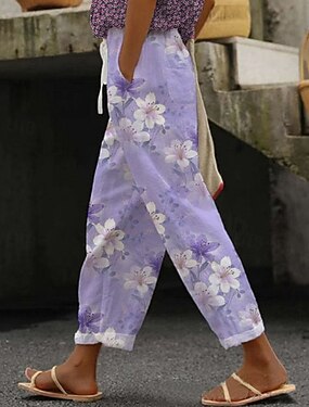 Dam Konstbomullslinne Sommarbyxor Beskurna byxor Harem byxor Streetwear Boho Ankellång Medium Midja Blomma Elastisk midja Bekväm Andningsfunktion Microelastisk Utomhus Dagliga kläder Purpur Sommar
