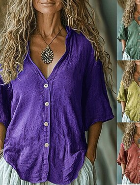 Dam Blus Konstbomullslinne Rynkad Knappar Ensfärgat Stylish Ledigt 3/4 ärm V-hals Vanliga toppar Dagligen Gul Rubinrött Purpur Grön Sommar