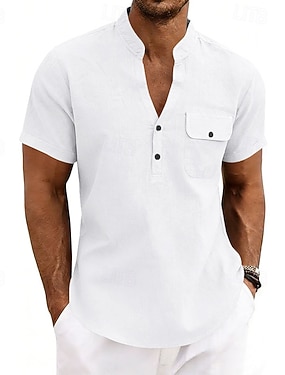 Herr Skjorta Linneskjorta Sommarskjorta Standkläder Henleytröja Ensfärgat Ledigt Semester Blå Svart Vit Marinblå Kortärmad V-hals Sommar Vår Kläder Ficka