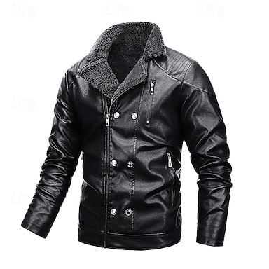Herr Imitationsläderjacka Motorcykeljacka Utomhus Vindtät jacka Fleecekrage Höst Vinter Ensfärgat Punk Aktiv Kort Svart Vinröd Jacka