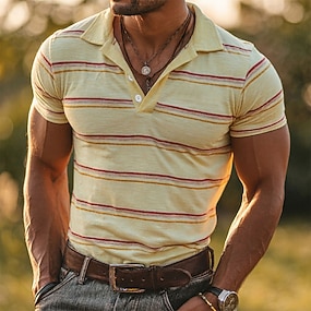 Herr Horisontella Strips Linje Pikétröjor Kortärmad Polotröjor Skjortor med krage Ledigt Fritids- Dagliga kläder Knappar Vår & sommar Blå Gul Grön