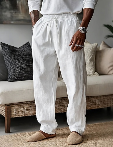 Herr Linne Byxor Långbyxor Sommarbyxor Säckiga byxor Strandbyxor Snörning Ficka Slät Komfort Andningsfunktion Fullängd Dagligen Hem Arbete Semester Stylish Vit Kaki Oelastisk