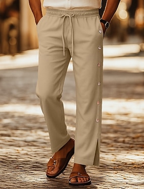 Herr Linne Byxor Långbyxor Sommarbyxor Säckiga byxor Strandbyxor Snörning Elastisk midja Knappar Slät Komfort Andningsfunktion Fullängd Hem Ledigt Dagligen Semester Mode Svart Vit Microelastisk
