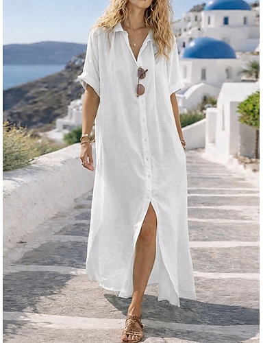 Dam Maxiklänning Konstbomullslinne Skjortklänning Vardagsklänning Grundläggande Ledigt Dagligen Semester Normal Slät Långärmad Tröjkrage Vit Ljusgrön Rodnande Rosa Sommar