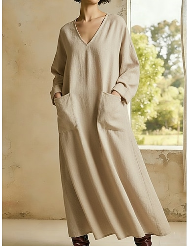 Dam Maxiklänning Konstbomullslinne Vardagsklänning Elegant Mode Modern Utomhus Semester Utekväll Lös passning Slät Långärmad V-hals Vit Gul Vinröd Kaki Sommar Vår