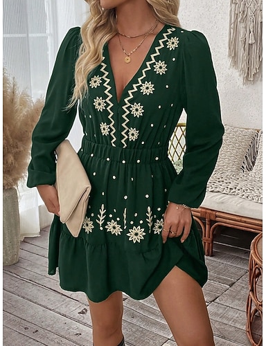 Dam Mini klänning Boho-klänning Vardagsklänning Elegant Mode Modern Utomhus Semester Utekväll Normal Blommig Långärmad V-hals Svart Vin Rubinrött Grön Sommar Vår