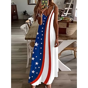 Självständighetsdag Patriotisk Kvinnors Maxi Klänning A-linje Klänning Slip Klänning Semester Avslappnad Gå Ut Reguljär Passform Grafisk Flagga Ärmös V-hals Spaghettiband Blå Marinblå Marinblå Sommar