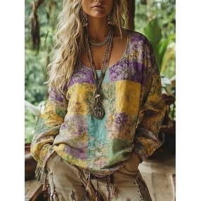 Dam Boho T-shirt T-shirt T-tröja Mönster Blommig Vintage Etnisk Ledigt Långärmad V-hals Vanliga toppar Dagligen Helgen Semesterkläder Purpur Sommar Vår Höst