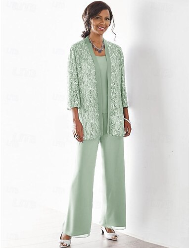 Strandbröllop byxdress 3-delad mamma till bruden formell bröllopsgäst elegant båtringning golvlängd chiffong spets paljetterad 3/4-lång ärm med spets paljetter gratis anpassning
