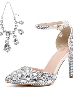 Damskor med spetsiga silverfärgade kristaller, eleganta brudpumps för brud i stadsstil