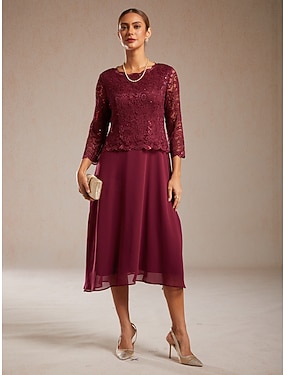 Dam Midiklänning A linjeklänning Elegant Kvällsfest Bröllopsgäst Spets Normal Ensfärgat 3/4 ärm Rund hals Vin