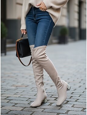 bruna damkängor över knäet - tjock klack, spetsig tå, snygga avslappnade höst- och vinterskor