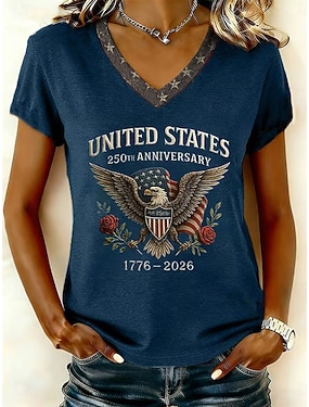 Självständighetsdag Amerikansk Anniversarium Patriotisk Kvinna T-shirt Tryck Grafisk Flagga Vintage Stilig Klassisk Kortärmad V-ringad Vanliga Toppar Dagsljus Blå Vit Marinblå Sommar Vår
