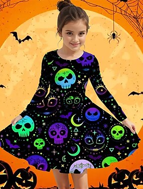 Halloween Flickor 3D Dödskalle Klänning Långärmad Sommar Vår Semester Dagligen Helgdag Prinsessa Skön Ljuv Barn 4-12 år Vardagsklänning A linjeklänning Knälång Normal