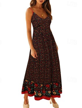Dam Långklänning Maxiklänning Vardagsklänning Sommarklänning Boho-klänning Klänning med tryck Mode Utomhus Fest Helgdag Normal Blommig Ärmlös V-hals Svart Sommar Vår