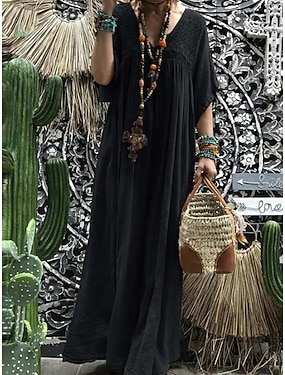 Dam Maxiklänning 100% Bomuld Skiftklänning Mode Dagligen Kontor Datum Lös passning Halvlång ärm V-hals Blå Svart Khaki grön Sommar