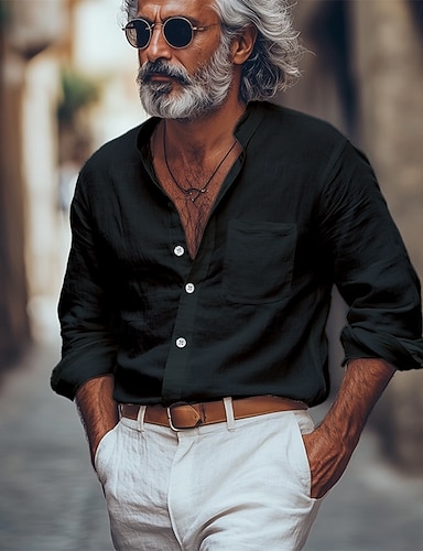 Herr Linneskjorta i bomull Slät Semester Svart Vit Kaki Mörkgrå Långärmad farfars krage Kläder Ficka