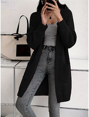 Dam Tröja Kofta Mode Streetwear Ledigt Ren färg Ribbad Öppen front Ficka Stickat Långärmad Långa toppar Sticka Utomhus Dagligen Helgen Vinrött Svart Höst Vinter
