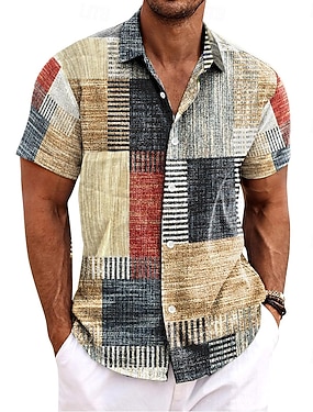 Herr Skjorta linneskjorta retro skjortor Vintage skjorta Etnisk skjorta Rutig Utomhus Hem Blå Khaki grön Grå Kortärmad Nedvikt Sommar Kläder