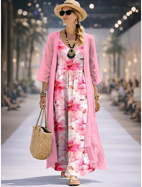 Dam Maxiklänning Vardagsklänning Klänning Set Chiffongklänningar Blommig klänning Elegant Mode Modern Utomhus Semester Utekväll Normal Blommig 3/4 ärm V-hals Rodnande Rosa Sommar Vår