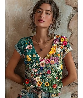 Dam T-shirt Mönster Blommig Grafisk Vintage Stylish Klassisk Kortärmad V-hals Vanliga toppar Dagligen Aska Svart Ljusgrön Rubinrött Grön Sommar Vår