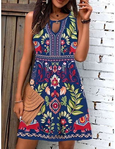 Halloween Dam Mini klänning Solklänning Sommarklänning Semester Boho Helgdag Normal Blommig Grafisk Paisley Ärmlös Rund hals Mörkblå Sommar Vår