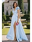 A-linje Golvlång Balklänning med kappa Kvälls klänningar Formell klädsel Elegant Hög split Silkig Ärmlös V-hals Bröllop Formell Caper Satäng med Broderad blomma Shouder blomma