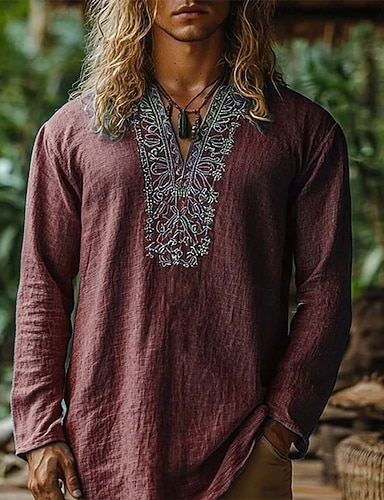 Herr Skjorta Linneskjorta Popover skjorta Sommarskjorta Standkläder Geometrisk Semester Gata Vin Marinblå Blå Långärmad V-hals Sommar Vår Kläder