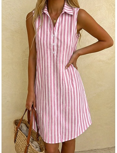 Dam Knälång klänning Skjortklänning Vardagsklänning Randig klänning Mode Grundläggande Dagligen Semester Normal Randig Ärmlös Tröjkrage Blå Svart Vin Grön Sommar Vår