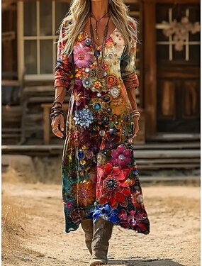 Dam Långklänning Maxiklänning Boho-klänning Vintage klänning Vardagsklänning Vintage Dagligen Utomhus Semester Normal Blommig Långärmad V-hals Vin Vår Höst