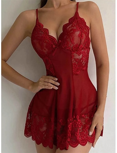 Dam Sexiga underkläder Nattlinne Varm Sexig Genomskinlig Ren färg Spets Tyll Hem Nattklubb Alla hjärtans dag Ärmlös V-hals Svart Vit Rodnande Rosa Vin Purpur Sommar Vår Smal