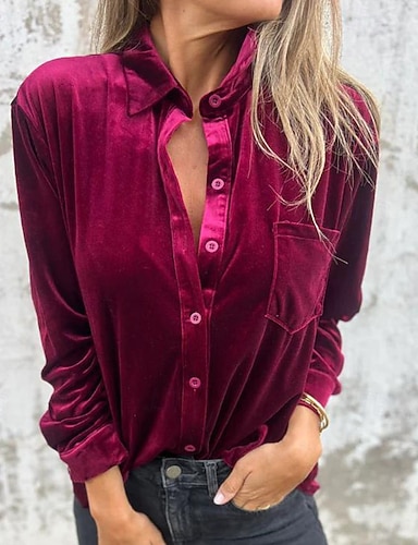 Dam Skjorta Sammet Elegant Blus Ficka Knappar Ensfärgat Elegant Stylish Långärmad Tröjkrage Vanliga toppar Arbete Helgdag Utekväll Armégrön Fuchsia Brun Vår Höst