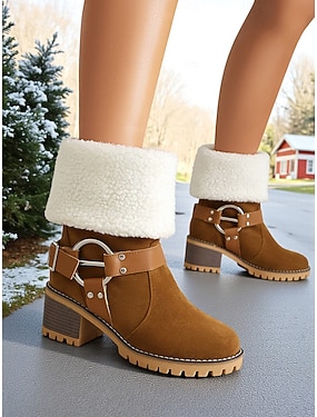 Damstövlar i konstmocka med fårskinnskrage och spänne – avslappnade vinterstövlar i grov klack för utomhusbruk, resor och mysiga outfits
