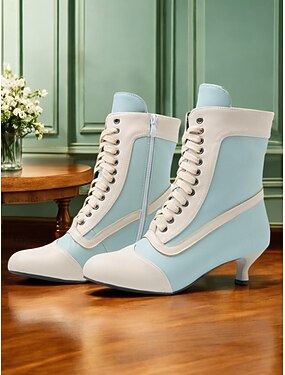Viktorianska damstövlar med snörning och låg klack, tvåfärgade svarta och vita stövlar i edwardiansk stil från 1900- till 1910-talet, vintage steampunk gotiska skor för cosplay, fester och vardagsbruk
