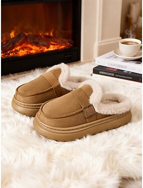 Damtofflor med slip-on-mockasiner, foder i fuskpäls och spänne – mysiga och snygga inomhustofflor för vinter, avkoppling, mys och komfort i kallt väder