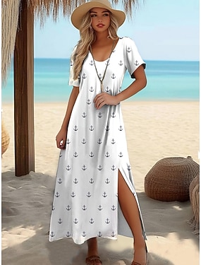 Dam Maxiklänning Solklänning Vardagsklänning A linjeklänning Elegant Semester Ledigt Strand Helgdag Normal Blommig Grafisk Kortärmad V-hals Vit Marinblå Sommar Vår