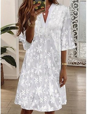 Dam Knälång klänning Spetsklänning Vit klänning Elegant Mode Strand Semester Helgdag Normal Blommig Halvlång ärm V-hals Vit Sommar Vår