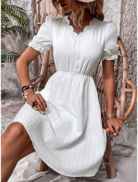 Dam Mini klänning Vit klänning Spetsklänning Mode Modern Utomhus Strand Semester Normal Slät Kortärmad Rund hals Svart Vit Aprikos Sommar Vår