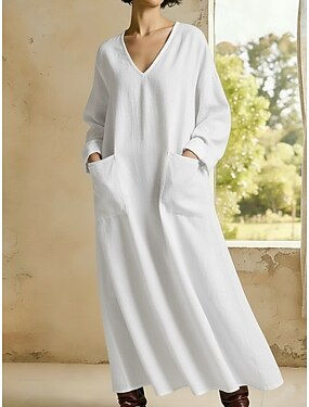 Dam Maxiklänning Konstbomullslinne Vardagsklänning Elegant Mode Modern Utomhus Semester Utekväll Lös passning Slät Långärmad V-hals Vit Gul Vinröd Kaki Sommar Vår