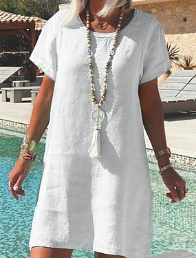 Kvinnors linne-liknande konstgjort bomulllinne midiklänning skiftklänning sommarklänning avslappnad daglig lös passform enfärgad kortärmad crew-hals vit röd sommar vår