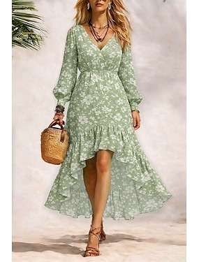Dam Maxiklänning Plisserad klänning Fit And Flare Klänning Födelsedag Ledigt Formell Strand Datum Normal Blommig Grafisk Långärmad V-hals Blå Gul Rodnande Rosa Grön Sommar Vår