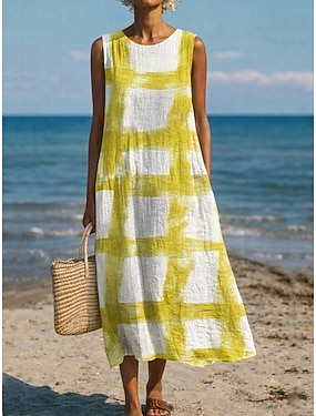 Dam Midiklänning Skiftklänning Solklänning A linjeklänning Semester Ledigt Boho Strand Utekväll Lös passning Grafisk Geometrisk Abstrakt Ärmlös Rund halsringning Vit Gul Grön Kaki Sommar Vår