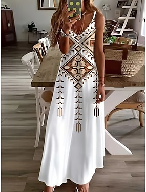 Dam Maxiklänning A linjeklänning Sommarklänning Slipklänning Semester Ledigt Boho Strand Normal Grafisk Geometrisk Ärmlös V-hals Smala axelband Vit Sommar Vår