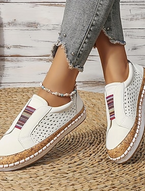 vita slip-on vardagsskor för kvinnor – andningsbara sneakers i konstläder med korkkant och resårband för promenader, resor och vardagsbruk
