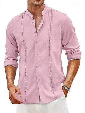Herr Skjorta Linneskjorta Guayabera skjorta Sommarskjorta Standkläder Knapp upp skjorta Ensfärgat Semester Helgdag Svart Vit Ljusgrön Rodnande Rosa Långärmad Tröjkrage Sommar Vår Kläder
