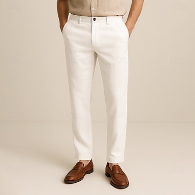 Herr Linne Byxor Ensfärgat Andningsfunktion Fullängd Formell Bröllop Utomhus Elegant Semester Svart Vit Microelastisk