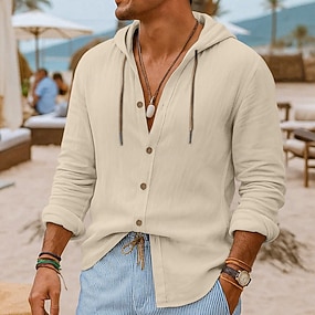 Herr Skjorta Linneskjorta Standkläder Knapp upp skjorta Huvtröja Slät Semester Ledigt Svart Vit Blå Grön Långärmad Huva Sommar Vår & sommar Kläder Knappar