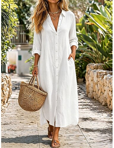 Dam Midiklänning Konstbomullslinne Skiftklänning Skjortklänning Vit klänning Grundläggande Modern Dagligen Helgen Lös passning Slät Halvlång ärm Rund hals Vit Sommar Vår
