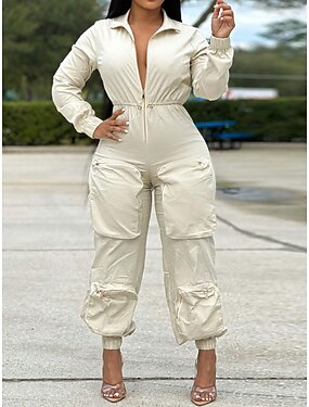 Dam Vanligt Jumpsuits Streetwear Ensfärgat Kortärmad Militärbyxor Tröjkrage Ficka Gata Dagligen Normal Svart Vit Kaki Höst